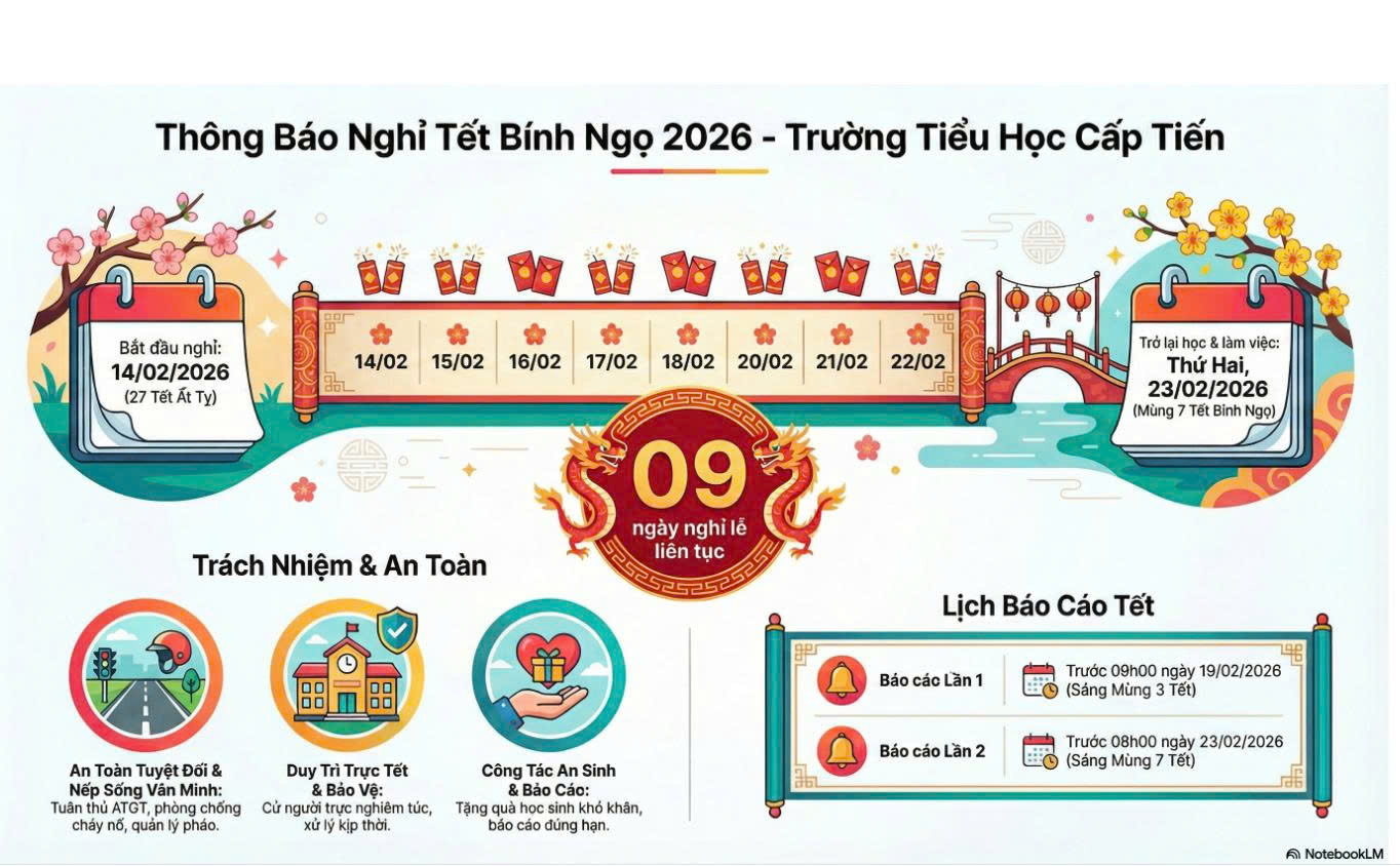 Trường Tiểu học Cấp Tiến trân trọng thông báo đến quý phụ huynh và các em học sinh lịch nghỉ Tết Nguyên đán Bính Ngọ 2026 như sau: