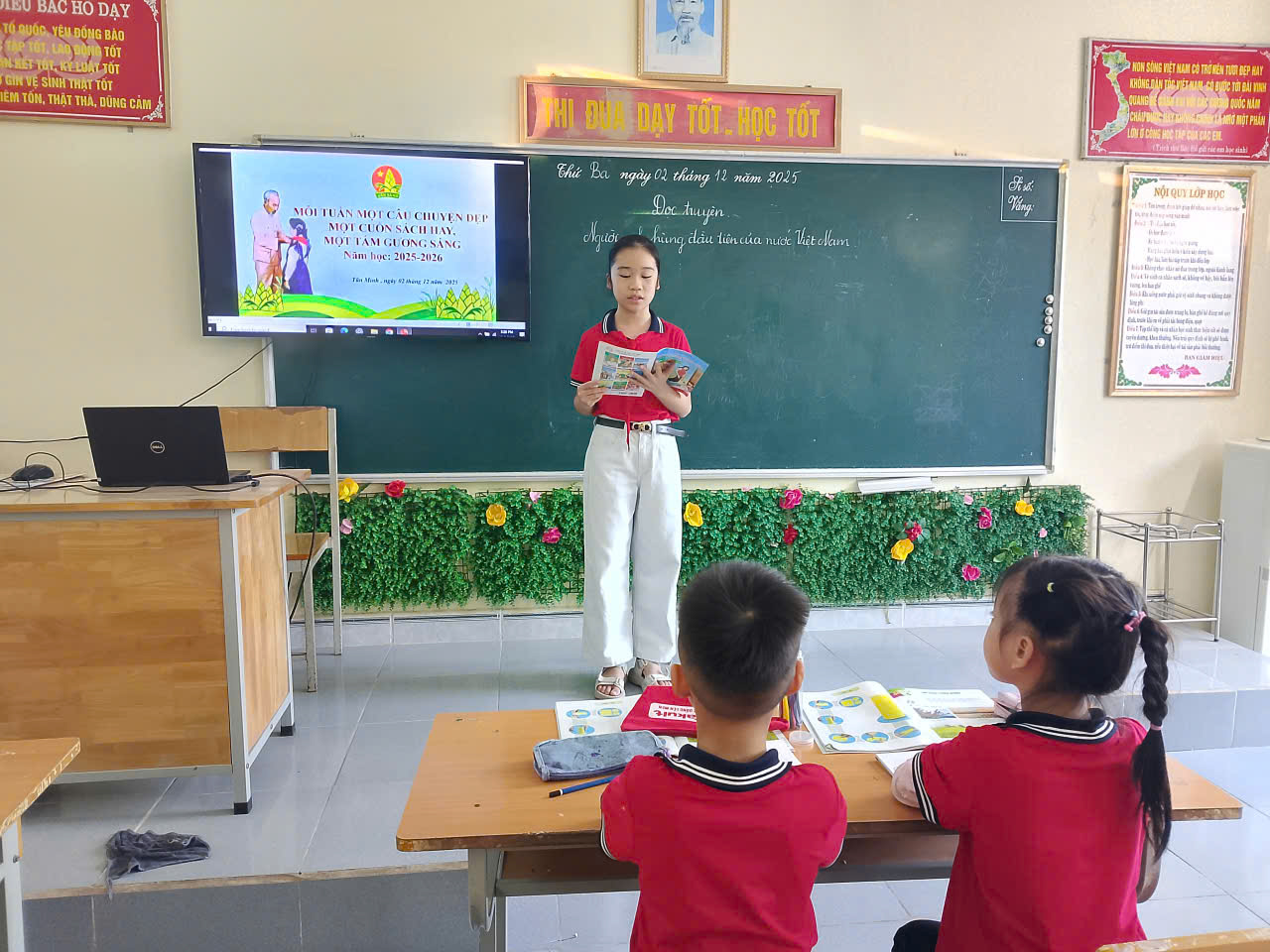 Liên đội trưởng Nguyễn Minh Thư đọc câu chuyện (Đôi dép cao su) cho các em HS lớp 2B nghe